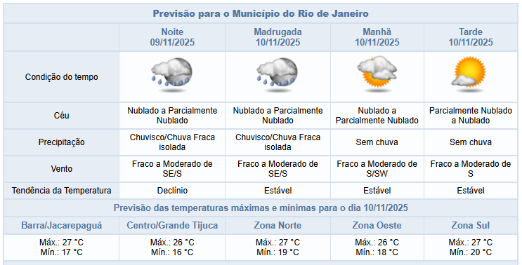 Segundo o Alerta Rio, nesta noite de domingo (09/11), o céu na cidade do Rio estará predominantemente nublado e há previsão de chuvisco a chuva fraca isolada. Os ventos estarão fracos a moderados. Ao longo do dia, o transporte de umidade do oceano em direção ao continente influenciou o tempo na capital. Assim, o céu esteve nublado a parcialmente nublado e houve registros de chuvisco a chuva fraca isolada. Os ventos apresentaram intensidade forte na madrugada, apresentando redução da intensidade a partir do período da manhã. As temperaturas apresentaram declínio acentuado em relação ao dia anterior, com mínima registrada de 17,4°C e máxima registrada de 25,4°C.