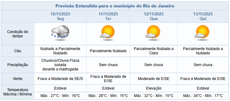 Entre a terça-feira e quinta-feira (11 a 13/11), o posicionamento de um sistema de alta pressão irá influenciar o tempo na cidade do Rio. Assim, haverá redução gradativa de nebulosidade e não há previsão de chuva. Os ventos estarão fracos a moderados.