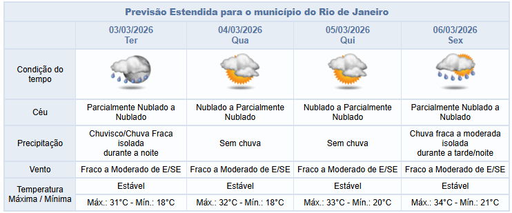 Na quarta-feira e na quinta-feira (04 e 05/03), em função da disponibilidade de umidade, a nebulosidade estará variada na cidade do Rio, contudo, não há previsão de chuva. Os ventos estarão fracos a moderados.