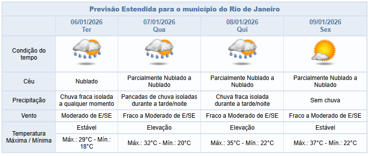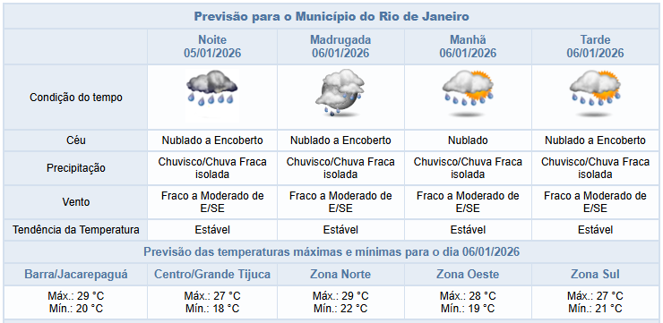 Na terça-feira (06/01), o tempo permanecerá instável com chuva fraca isolada durante a madrugada/manhã. Os ventos estarão moderados.