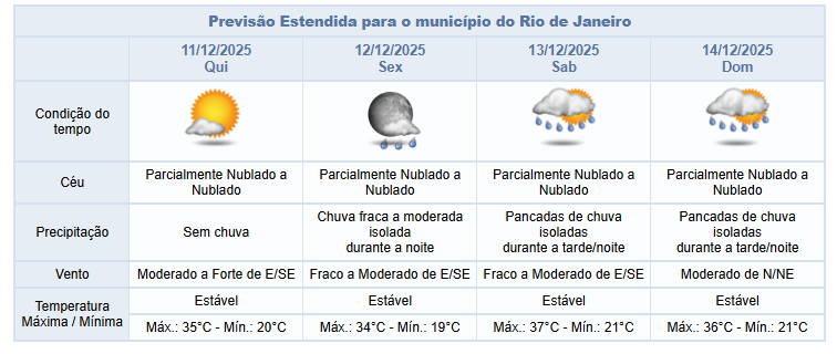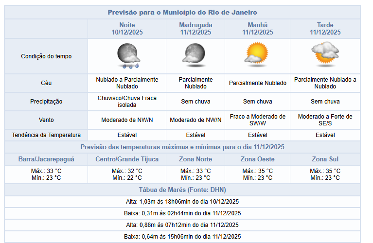 Já na sexta-feira (12/12), o céu estará variando entre parcialmente nublado e nublado e há previsão de chuva fraca a moderada isolada no final do período da noite. Os ventos estarão fracos a moderados.