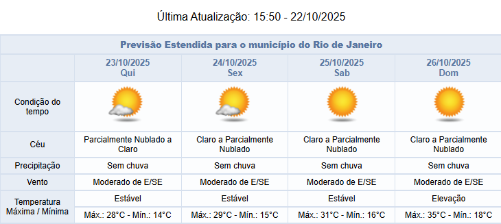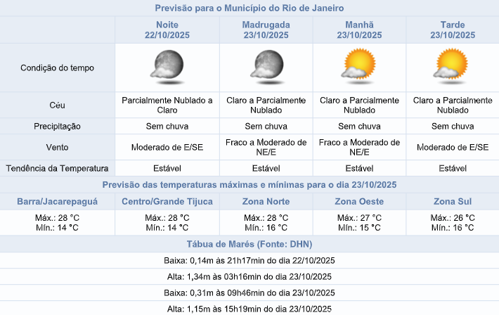 Segundo o Alerta Rio, neste final de tarde e na noite de quarta-feira (22/10), o céu estará parcialmente nublado a claro na cidade do Rio de Janeiro e não há previsão de chuva. Os ventos estarão moderados (18,5 km/h até 51,9 km/h).