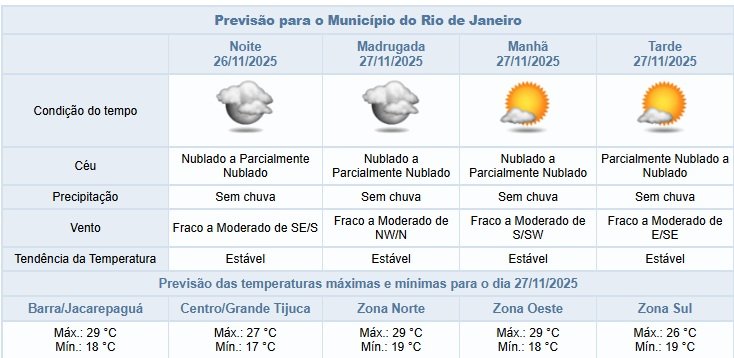 Segundo o Sistema Alerta Rio, nesta noite de quarta-feira (26/11) o céu estará nublado a parcialmente nublado na cidade do Rio de Janeiro e não há previsão de chuva. Os ventos estarão moderados até o final da tarde.