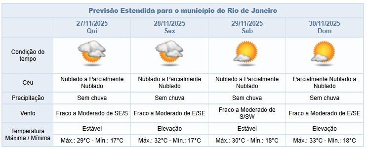 Noite de quarta-feira (26/11) sem chuva previsão de chuva na cidade do Rio | Confira os próximos dias