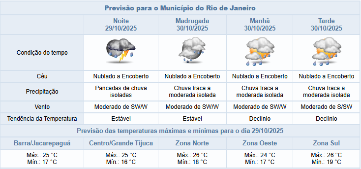 Neste fim de tarde e noite de quarta-feira (29/10), o carioca pode esperar céu nublado na cidade do Rio, com a possibilidade de pancadas de chuvas isoladas, que podem vir acompanhadas por raios. Os ventos estarão predominantemente moderados. Ao longo do dia, o tempo foi influenciado pela aproximação de uma frente fria. Desta forma, o céu esteve predominantemente nublado e houve registro de chuviscos isolados. Os ventos estiveram fracos a moderados e as temperaturas permaneceram estáveis em relação ao dia anterior, com mínima registrada de 19°C e máxima de 34,4°C.