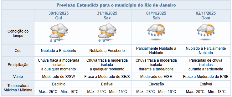 Na quinta e na sexta-feira (30/10 e 31/10), o tempo será influenciado pelo transporte de umidade do oceano. O céu estará nublado a encoberto e há previsão de chuva fraca a moderada isolada a qualquer momento. Os ventos irão variar entre fracos e moderados, sendo mais intensos na quinta-feira. As temperaturas estarão em declínio.