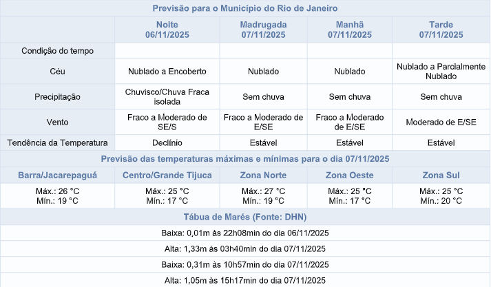 Segundo o Alerta Rio, neste final de tarde e na noite desta quinta-feira (06/11), o céu estará nublado a encoberto na cidade do Rio de Janeiro e há previsão de chuvisco/chuva fraca isolada. Os ventos estarão fracos a moderados (18,5 km/h até 51,9 km/h).