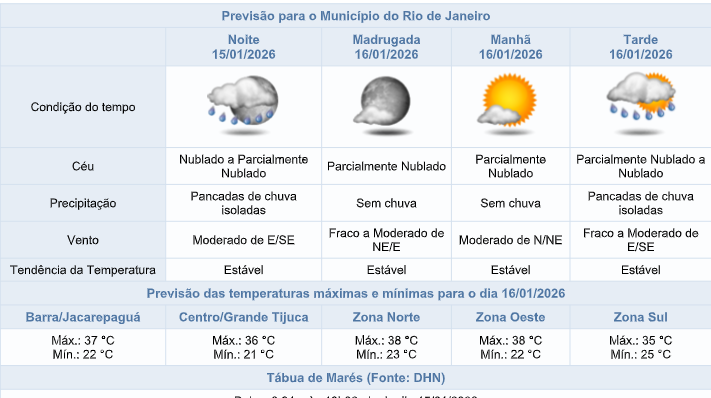 De acordo com o Sistema Alerta Rio, na noite de quinta-feira (15/01), o céu estará parcialmente nublado a nublado e há previsão de pancadas de chuva isoladas. Os ventos estarão moderados.