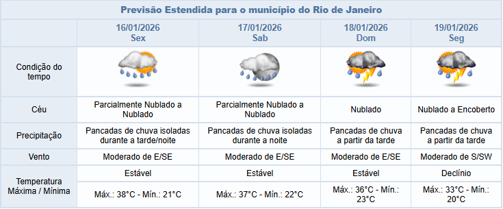 Entre sexta-feira e sábado (16/01 e 17/01), a atuação de áreas de instabilidade associadas ao calor influenciarão o tempo na cidade do Rio. A previsão é de céu parcialmente nublado a nublado com pancadas de chuva isoladas a partir da tarde desta sexta-feira, e pancadas de chuva isoladas no período da noite de sábado. Os ventos estarão moderados.