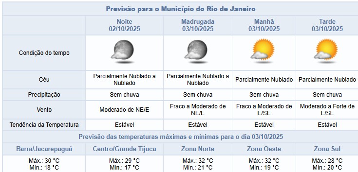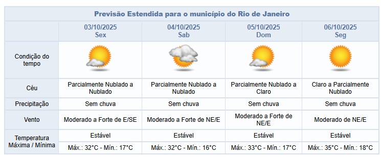 Entre sexta e segunda-feira (3/10 a 6/10), o céu varia de nublado a parcialmente nublado na cidade do Rio, sem previsão de chuva. As temperaturas permanecem elevadas. Os ventos estarão predominantemente moderados, principalmente nas regiões próximas do litoral, sendo ocasionalmente fortes entre sexta-feira e domingo.