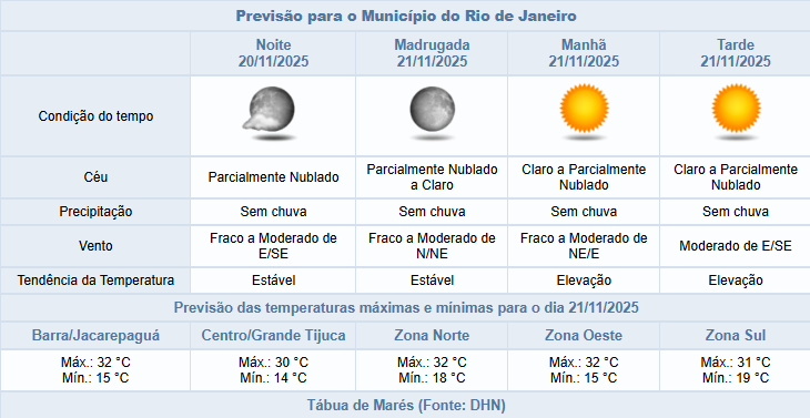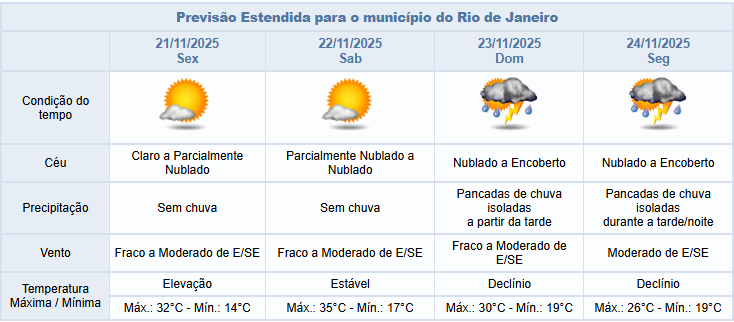 Na sexta-feira e no sábado (21/11 e 22/11), o tempo estará estável na cidade do Rio, com predomínio de céu parcialmente nublado e sem chuva. Os ventos estarão variando entre fracos a moderados, sendo mais intensos no período da tarde de ambos os dias, e as temperaturas apresentarão elevação.
