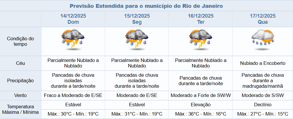 No domingo (14/12), a atuação de áreas de instabilidade manterão o tempo instável no Rio, com céu parcialmente nublado a nublado com pancadas de chuva isoladas nos períodos da madrugada e tarde/noite, acompanhadas de raios. Os ventos estarão variando entre fracos e moderados.
