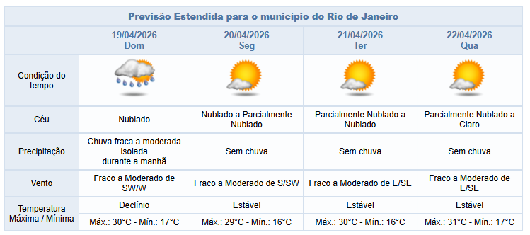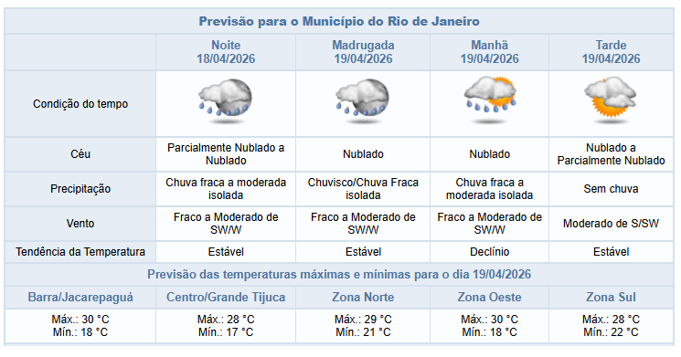 Nesta noite de sábado (18/04), o céu estará parcialmente nublado a nublado na cidade do Rio, os ventos fracos a moderados e há previsão de chuva fraca a ocasionalmente moderada isolada, devido a áreas de instabilidade, de acordo com o Alerta Rio. Ao longo do dia, as temperaturas ficaram estáveis em relação ao dia anterior, com mínima registrada de 18,8°C e máxima de 34,3°C.