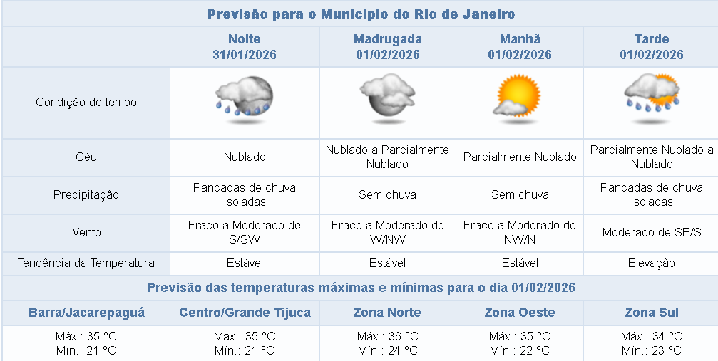 Segundo o Alerta Rio, na noite deste sábado (31/01), a nebulosidade estará variada, com possiblidade de pancadas de chuva isoladas. Os ventos estarão fracos a moderados.