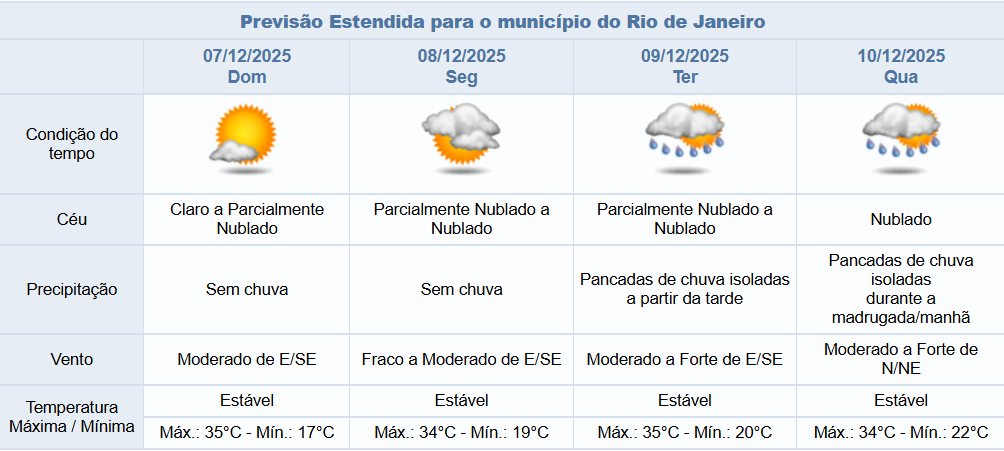 No domingo (07/12), o tempo fica estável na cidade do Rio, em função de um sistema de alta pressão. Desta forma, o céu estará com poucas nuvens e não há previsão de chuva. Os ventos estarão predominantemente moderados.