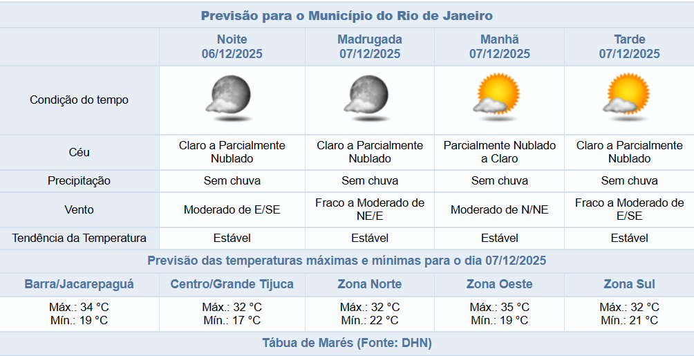 De acordo com o Sistema Alerta Rio, na noite deste sábado (06/12), o céu estará claro a parcialmente nublado e não há previsão de chuva. Os ventos estarão moderados.