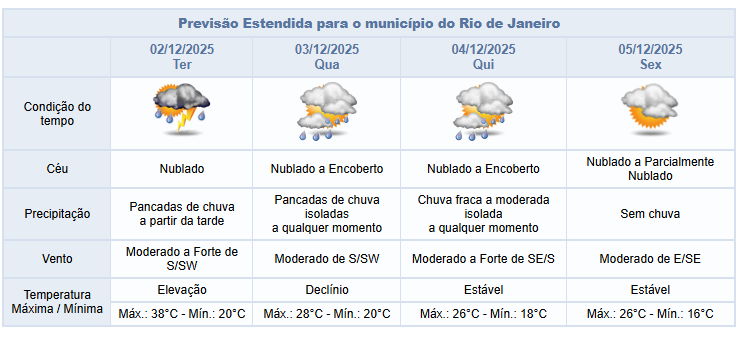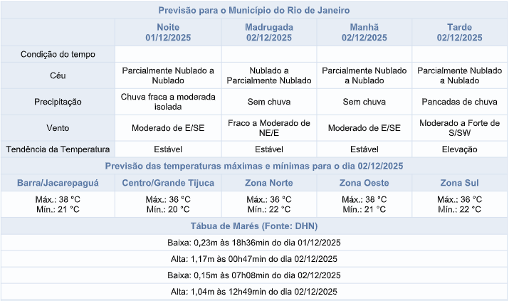 Na quarta-feira (03/12), o tempo segue instável, com o deslocamento deste sistema de baixa pressão e a entrada de umidade do oceano em direção à cidade do Rio. Desta forma, o céu estará nublado a encoberto e a previsão é de pancadas de chuva isoladas a qualquer momento. Os ventos estarão predominantemente moderados.