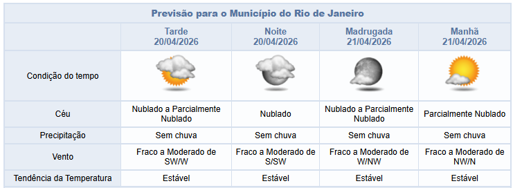 Segundo o Alerta Rio, a noite desta segunda-feira (20/04) será de céu nublado a parcialmente nublado, e sem ocorrência de chuva. Os ventos estarão fracos a moderados. Ao longo do dia, o tempo na cidade foi influenciado pela entrada de ventos úmidos do oceano. Assim, a nebulosidade esteve variada e não houve registro de chuva. Os ventos estiveram fracos a moderados e as temperaturas permaneceram estáveis, com mínima registrada de 16,6°Ce máxima registrada de 29,9°C.