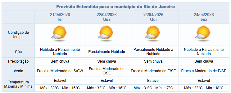 Entre os terça e sexta-feira (21 a 24/04), o céu terá nebulosidade variada. Os ventos estarão fracos a moderados e não há previsão de chuva.