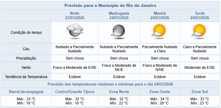 Segundo o Sistema Alerta Rio, a previsão para a noite desta segunda-feira (23/03) é de céu nublado a parcialmente nublado, sem chuva, com ventos fracos a moderados. Ao longo do dia, o tempo na cidade foi influenciado por áreas de instabilidade em altos níveis e a presença de umidade. Assim, a nebulosidade esteve variada e houve registro de pancadas de chuva rápidas e isoladas, de intensidade moderada a pontualmente forte, principalmente no entorno da Baía de Guanabara, durante a tarde. Os ventos estiveram fracos a moderados e as temperaturas permaneceram estáveis, com mínima registrada de 18,6°C e máxima registrada de 32,1°C.