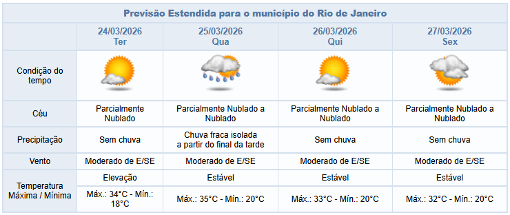 Na quarta-feira (25/06), o céu estará parcialmente nublado a nublado, com ventos moderados e chuva fraca isolada a partir do final da tarde, enquanto, para quinta-feira (26/03), não há previsão de chuva. Na sexta-feira (27/03), a previsão segue com céu parcialmente nublado a nublado, sem chuva, e com ventos moderados.