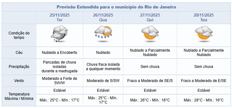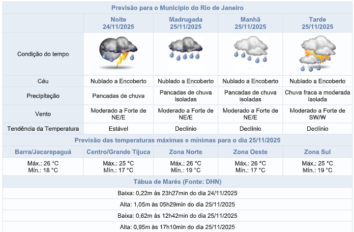 Na quarta-feira (26/11), em função da entrada de ventos úmidos do oceano, a previsão para a cidade do Rio é de céu predominantemente nublado com chuva fraca isolada a qualquer momento. Os ventos estarão predominantemente moderados.