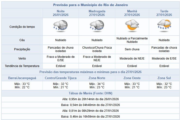 Segundo o Alerta Rio, nesta noite de segunda-feira (26/01), o céu estará nublado e há previsão de pancadas de chuva podendo vir com raios. Os ventos estarão fracos (até 18,5km/h) a moderados (18,5 km/h até 51,9km/h).