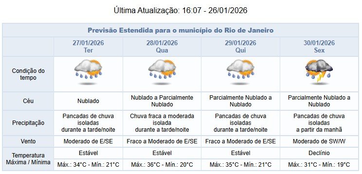 Na sexta-feira (30/01), áreas de instabilidade, associadas à formação de um sistema de baixa pressão na costa do Sudeste, deixarão o tempo instável na cidade do Rio. Assim, o céu estará nublado e há previsão de pancadas de chuva a partir do final da manhã, podendo vir com raios. Os ventos estarão moderados (entre 18,5 km/h a 51,9 km/h) e as temperaturas apresentarão declínio. Máxima prevista de 31ºC.