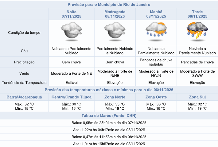 Segundo o Sistema Alerta Rio, nesta noite de sexta-feira (07/11), o céu estará nublado na cidade do Rio de Janeiro e não há previsão de chuva. Os ventos estarão moderados (entre 18,5 a 51,9 km/h) a ocasionalmente fortes (entre 52 km/h até 76 km/h) no período da noite .