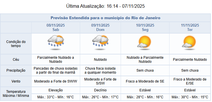 Neste sábado (08/11), o deslocamento de um sistema de baixa pressão pela costa da região Sudeste e a aproximação e passagem de uma frente fria associada a este sistema irão influenciar o tempo na cidade do Rio de Janeiro. Assim, a nebulosidade estará variada e há previsão de pancadas isoladas de chuva a partir do final da manhã. Os ventos estarão moderados a fortes.