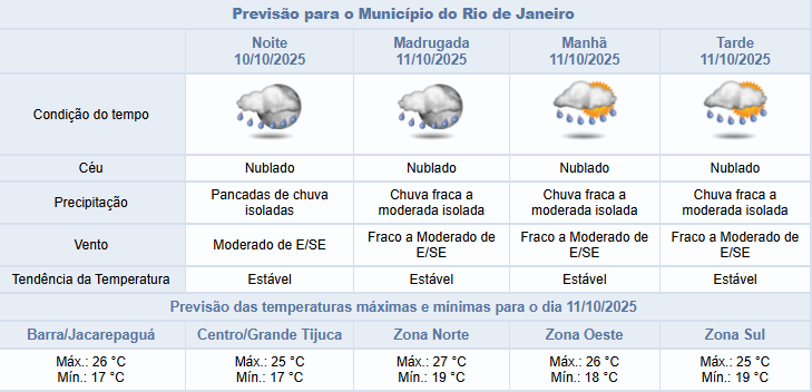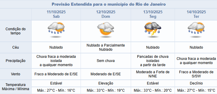 No sábado (11/10) o tempo permanecerá instável, com céu nublado. Há previsão de chuva fraca a ocasionalmente moderada até o período da tarde, passando a chuva fraca à noite.