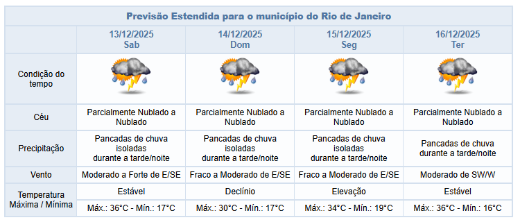 Na terça-feira (16/12), devido a áreas de instabilidade associadas e à aproximação de uma frente fria no final do dia, a previsão para a cidade do Rio é de céu parcialmente nublado a nublado com pancadas de chuva isoladas nos períodos da tarde e noite, acompanhadas de raios. Os ventos estarão moderados.