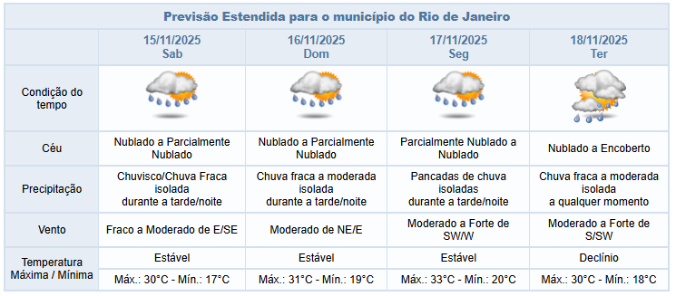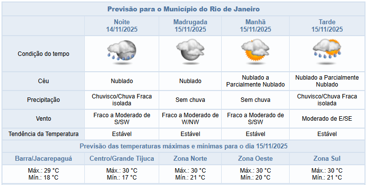 Na noite desta sexta-feira (14/11), o céu estará nublado a parcialmente nublado na cidade do Rio, e há previsão de chuvisco a chuva fraca isolada. Os ventos estarão fracos a moderados. Até o fim da tarde, o céu esteve nublado a parcialmente nublado e não houve registro de chuva. Os ventos ficaram fracos a moderados, sendo mais intensos no período da tarde e as temperaturas permaneceram estáveis em relação ao dia anterior, com mínima registrada de 17,6°C e máxima registrada de 30,5°C.
