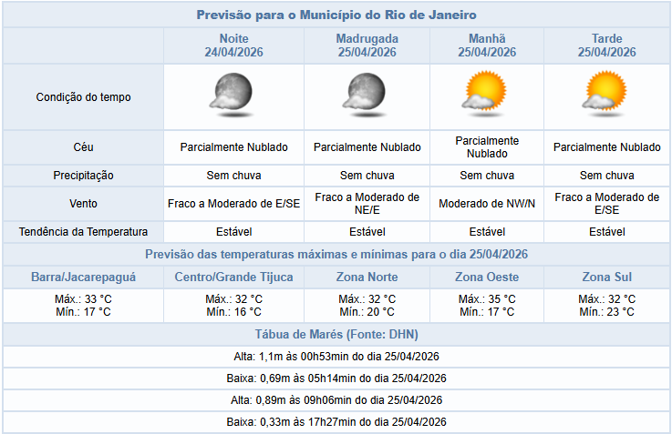 Segundo o Alerta Rio, o final da tarde e a noite desta sexta-feira (24/04), de céu com poucas nuvens na cidade do Rio de Janeiro, os ventos fracos a moderados e não há previsão de chuva.