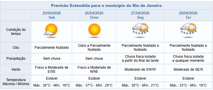 No sábado (25/04) e no domingo (26/04), a previsão para a cidade do Rio é de céu com poucas nuvens e sem chuva. Os ventos estarão fracos a moderados e as temperaturas estáveis e elevadas. A umidade relativa do ar poderá atingir valores entre 21% e 30% em algum ponto da cidade.