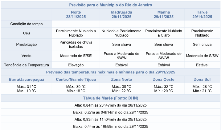 Segundo o Alerta Rio, nesta noite de sexta-feira (28/11), o céu estará parcialmente nublado a nublado e há previsão de pancadas de chuva isoladas, podendo vir com raios e rajadas de vento, na cidade do Rio.