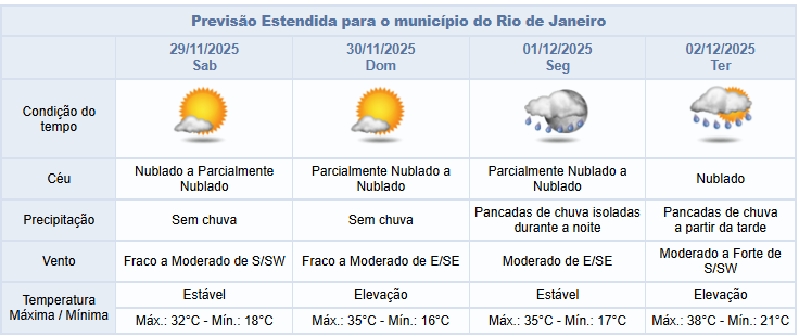 No sábado e no domingo (29/11 e 30/11), haverá redução gradativa da nebulosidade e não há previsão de chuva. Os ventos estarão fracos a moderados.