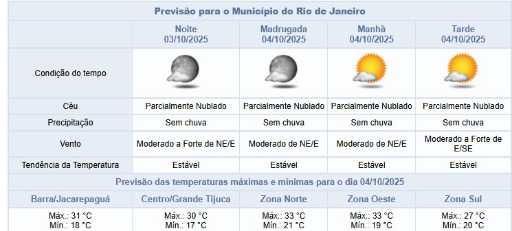Segundo o Sistema Alerta Rio, o céu estará parcialmente nublado na cidade do Rio de Janeiro e não há previsão de chuva na noite desta sexta-feira (3/10). Os ventos estarão moderados (entre 18,5 km/h a 51,9 km/h), podendo ser ocasionalmente fortes (entre 52 km/h a 76 km/h), principalmente em áreas próximas ao litoral.