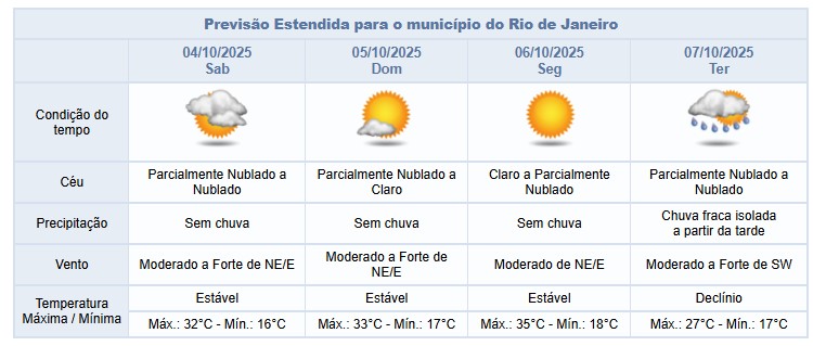 Entre sábado e segunda-feira (4/10 a 6/10), a nebulosidade estará variada na cidade do Rio, sem previsão de chuva. As temperaturas permanecerão elevadas. Os ventos poderão ser predominantemente moderados, principalmente nas regiões próximas do litoral, sendo ocasionalmente fortes no sábado e no domingo.
