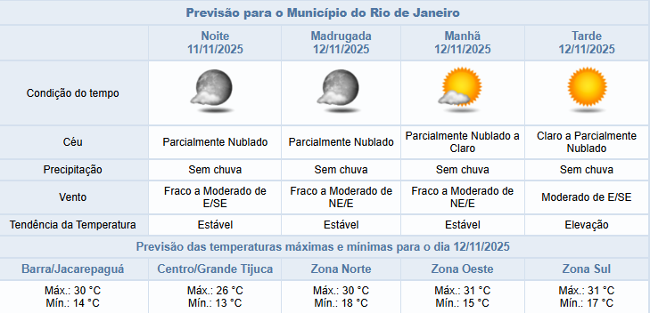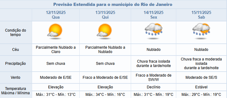 Na quarta e quinta-feira (12 e 13/11), a nebulosidade estará variada na cidade do Rio e não há previsão de chuva. Os ventos estarão variando entre fracos a moderados.