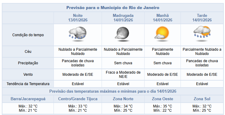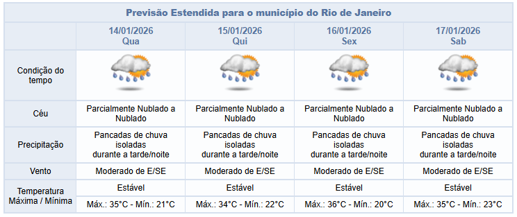 Entre quarta-feira e sábado (14/01 e 17/01), a previsão para a capital fluminense é de céu parcialmente nublado a nublado com pancadas de chuva isoladas a partir da tarde. Os ventos estarão moderados.
