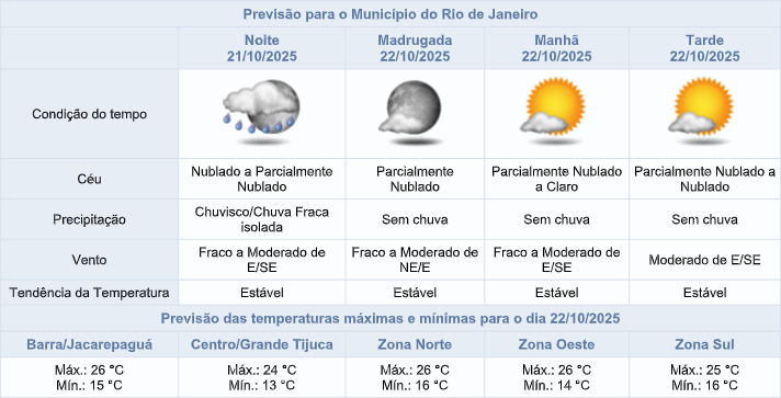 Segundo o Sistema Alerta Rio, nesta noite de terça-feira (21/10), o céu estará parcialmente nublado a nublado no município, há previsão de chuvisco/chuva fraca isolada até o início da noite. Os ventos estarão fracos a moderados.