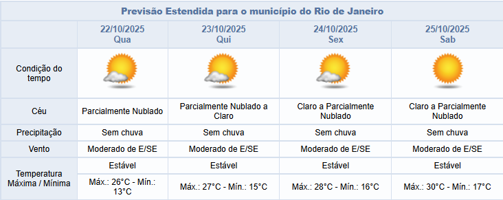 Entre esta quarta-feira e o próximo sábado (22/10 e 25/10), um sistema de alta pressão irá influenciar as condições de tempo na capital fluminense. A nebulosidade estará variada e não há previsão de chuva. Os ventos estarão moderados (18,5km/h até 51,9km/h) no período da tarde/noite destes dias.