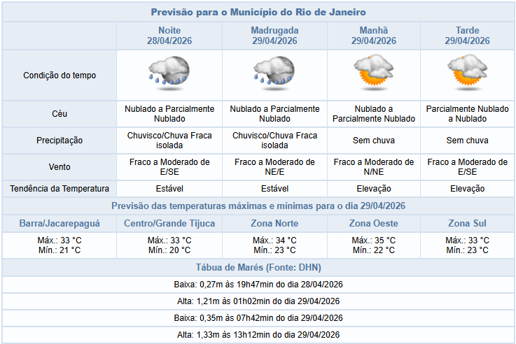 Segundo o Sistema Alerta Rio, neste final de tarde e noite de terça-feira (28/04), a nebulosidade estará variada na cidade do Rio, com previsão de chuvisco/chuva fraca isolada. Os ventos estarão fracos a moderados (18,5 km/h até 51,9 km/h).