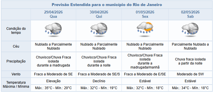 Entre a quarta-feira e a sexta-feira (29/04 e 01/05) a nebulosidade segue variada no município. A previsão é de chuvisco/chuva fraca, isolada, na madrugada da quarta-feira e entre a noite de quinta-feira e manhã de sexta-feira. Os ventos estarão fracos a moderados.