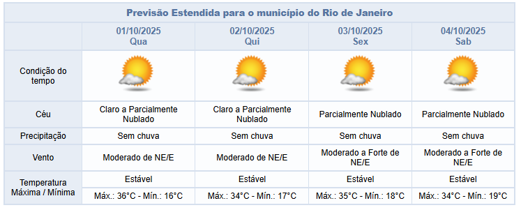 Entre quarta-feira e sábado (30/9 a 04/10), o tempo seguirá estável. O céu estará parcialmente nublado e não há previsão de chuva. Há previsão de ventos moderados (entre 18,5 a 51,9 km/h), principalmente nas regiões litorâneas, podendo ser fortes (52 a 76 km/h) entre sexta-feira e sábado.