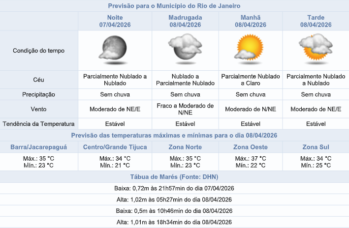 Segundo o Sistema Alerta Rio, nesta noite de terça-feira (07/04), a nebulosidade estará variada, não há previsão de chuva e os ventos estarão ocasionalmente moderados.