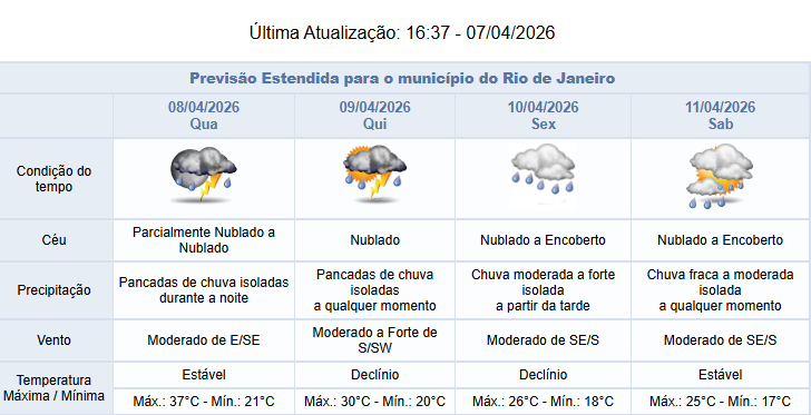 Na quinta-feira (09/04), em função da passagem desta frente fria continental, a previsão para a cidade do Rio é de céu predominantemente nublado com pancadas de chuva moderada a ocasionalmente fortes de forma isolada a qualquer momento. Os ventos estarão moderados a pontualmente fortes e as temperaturas apresentarão declínio.