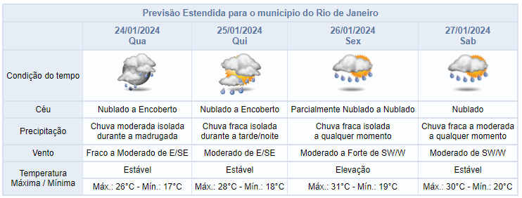 Na quarta-feira (24/01), o tempo permanece instável e há previsão de chuva moderada na madrugada, e chuva fraca a moderada isolada a qualquer momento do restante do dia. A chuva poderá passar de 6,4 mm/15min.