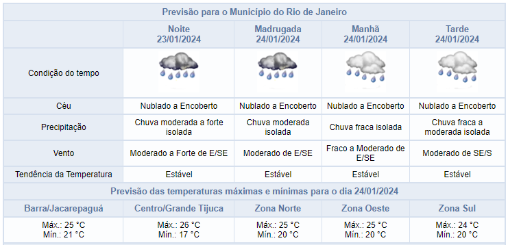 Segundo o Alerta Rio, para a noite desta terça-feira (23/01), a previsão é de céu nublado a encoberto, com chuva fraca a moderada a qualquer momento, podendo ser forte em alguns pontos. A chuva poderá passar de 25 mm/h. Os ventos estarão moderados, ocasionalmente fortes. A atuação de áreas de instabilidade, em conjunto com o transporte de umidade do oceano, manteve o tempo instável sobre a cidade do Rio de Janeiro nesta terça-feira. O predomínio foi de céu encoberto e houve registro de chuva fraca a moderada ao longo do dia, sendo forte em alguns momentos no período da tarde. Os ventos estiveram moderados, com registro de rajadas ocasionalmente fortes, e as temperaturas apresentaram declínio em relação ao dia anterior, com máxima registrada de 26,6°C às 09h45min e mínima registrada, até o momento, de 18,1°C às 14h45min.